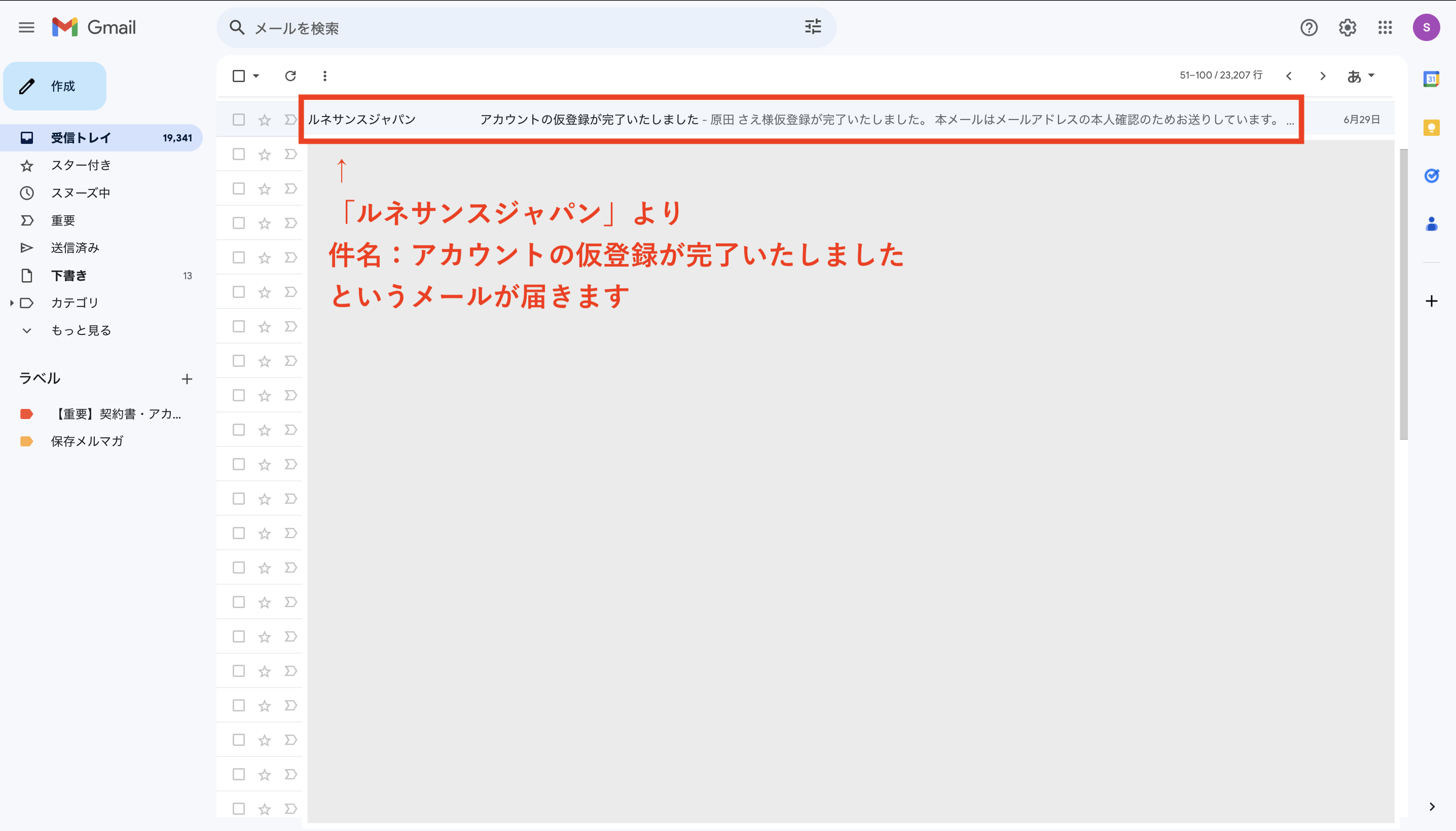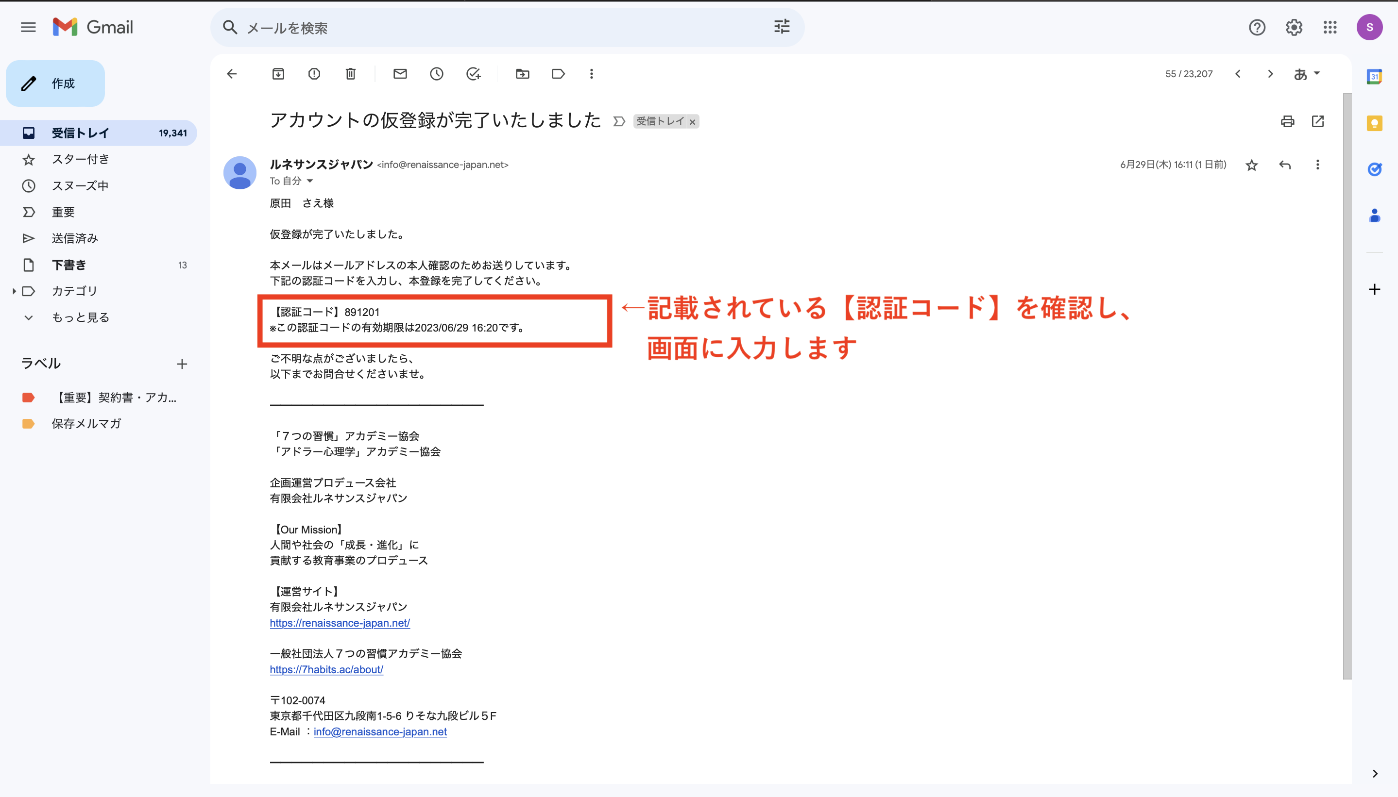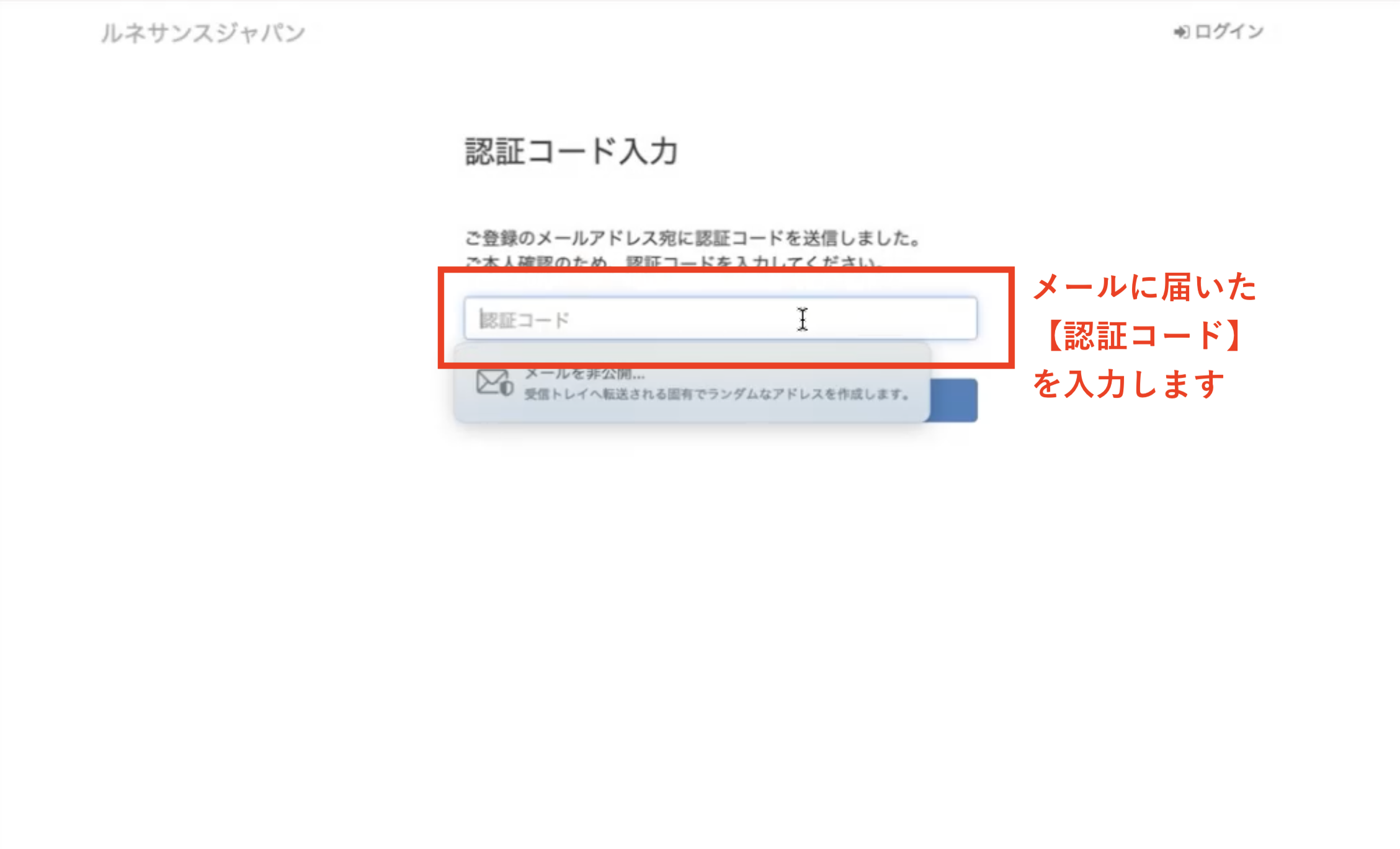 ③②で入力したメールアドレスに届いている認証コードを確認し、入力します