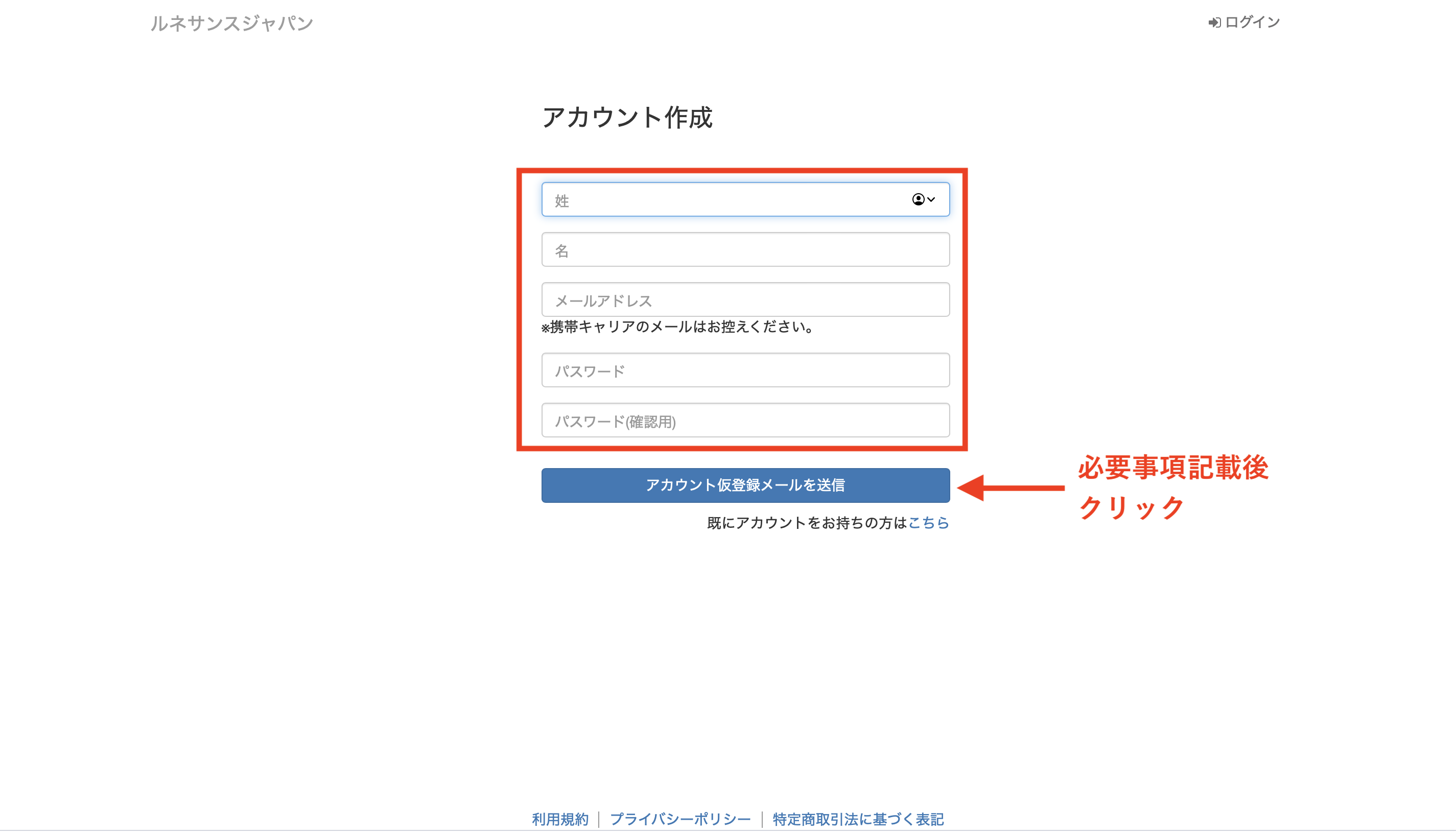 ②姓・名、メールアドレス、パスワード(確認用含む)の必要事項を入力し、