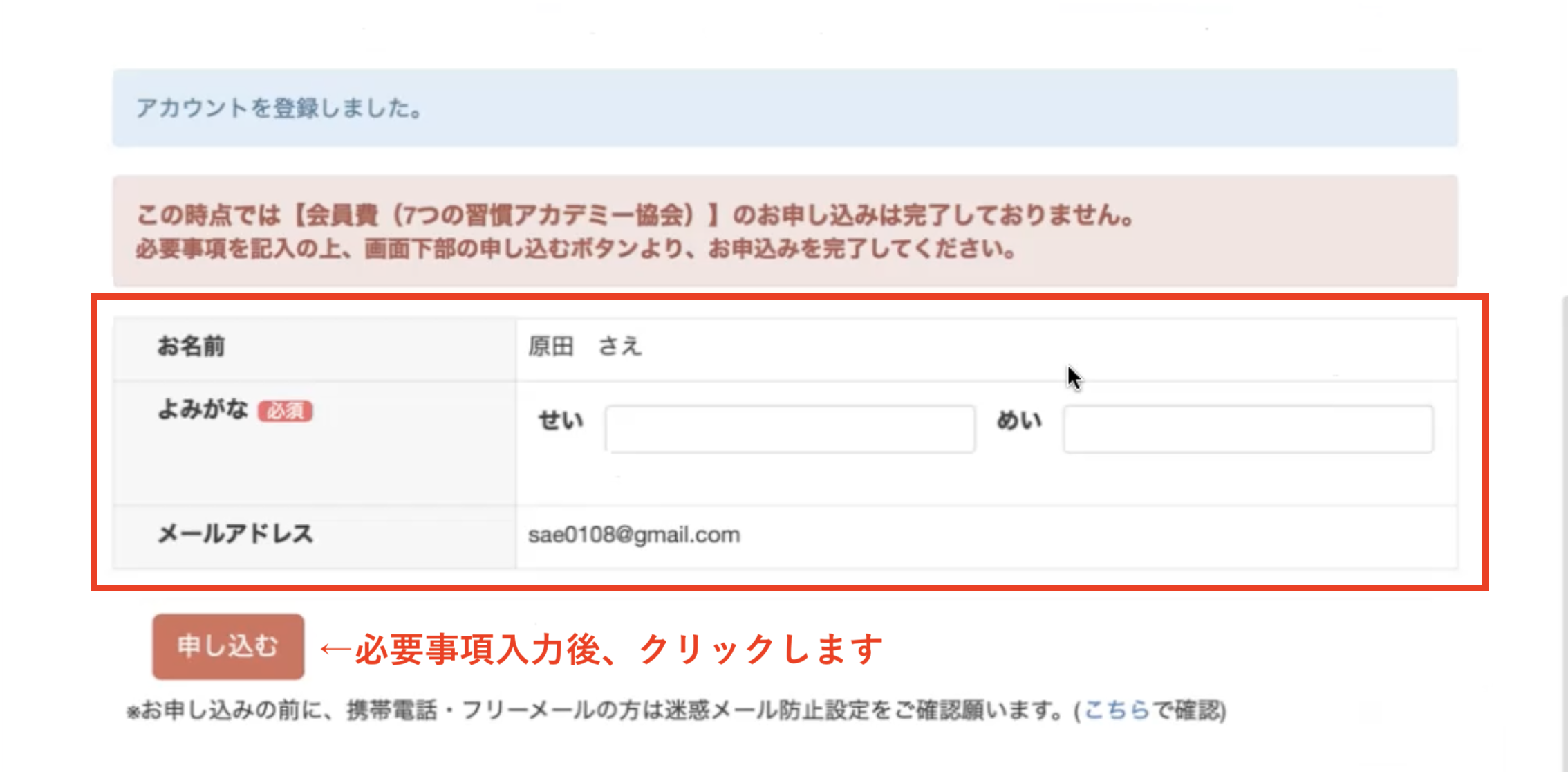 ④「アカウントを登録しました」という画面になったら、お名前、よみがな を入力し、