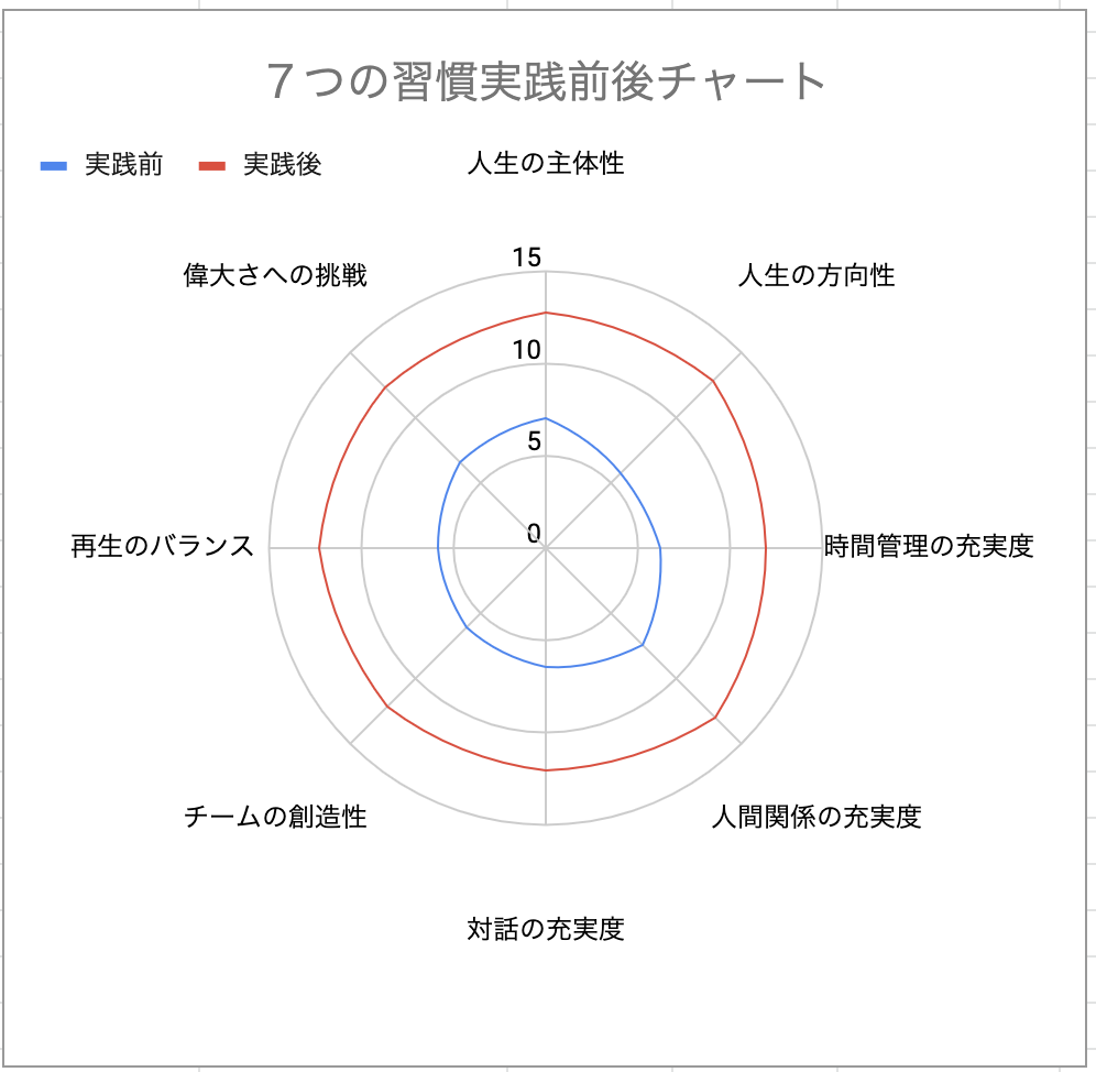 7つの習慣®︎を学ぶ前と、学んだ後とでは、自分がどんな変化を遂げているのか、 24個の質問に回答することで自分自身を振り返るワークショップが盛り上がりました。人生の役割が改善したエピソード、家族・チーム・社会での信頼関係・ 相互理解・シナジー・成長の螺旋など、グループシェアがとっても賑やか!このワークショップでは、回答いただいた結果を元に、学ぶ前後の 変化を8つの軸で視覚的に確認できるレーダーチャートが作成することができます。 ご参加いただいた方には、後日チャートをお送りしますので、どうぞお楽しみに!